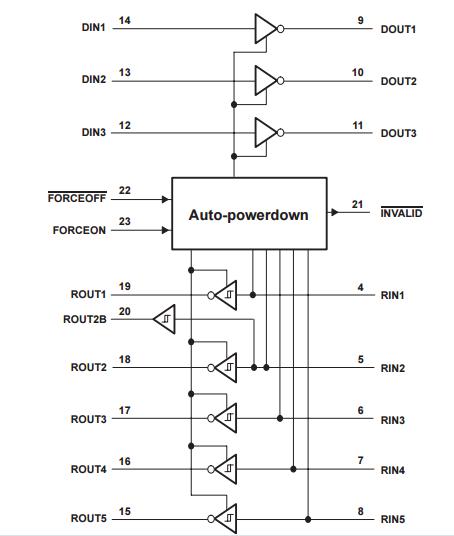 If FORCEOFF is set low, both drivers and receivers (except ROUT2B) are shut off, and the supply current is reduced to 1 µA. Disconnecting the serial port or turning off the peripheral drivers causes the auto-powerdown condition to occur.